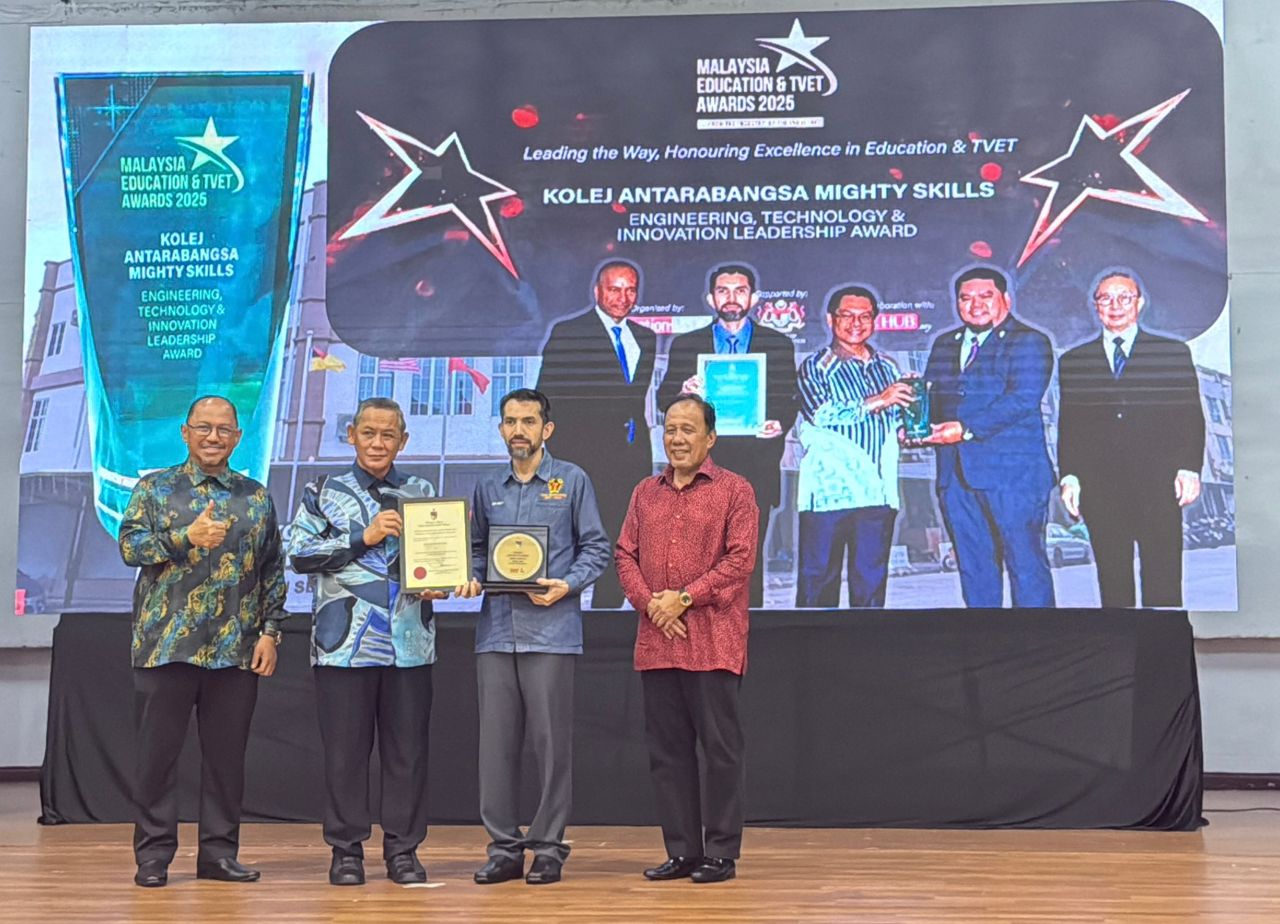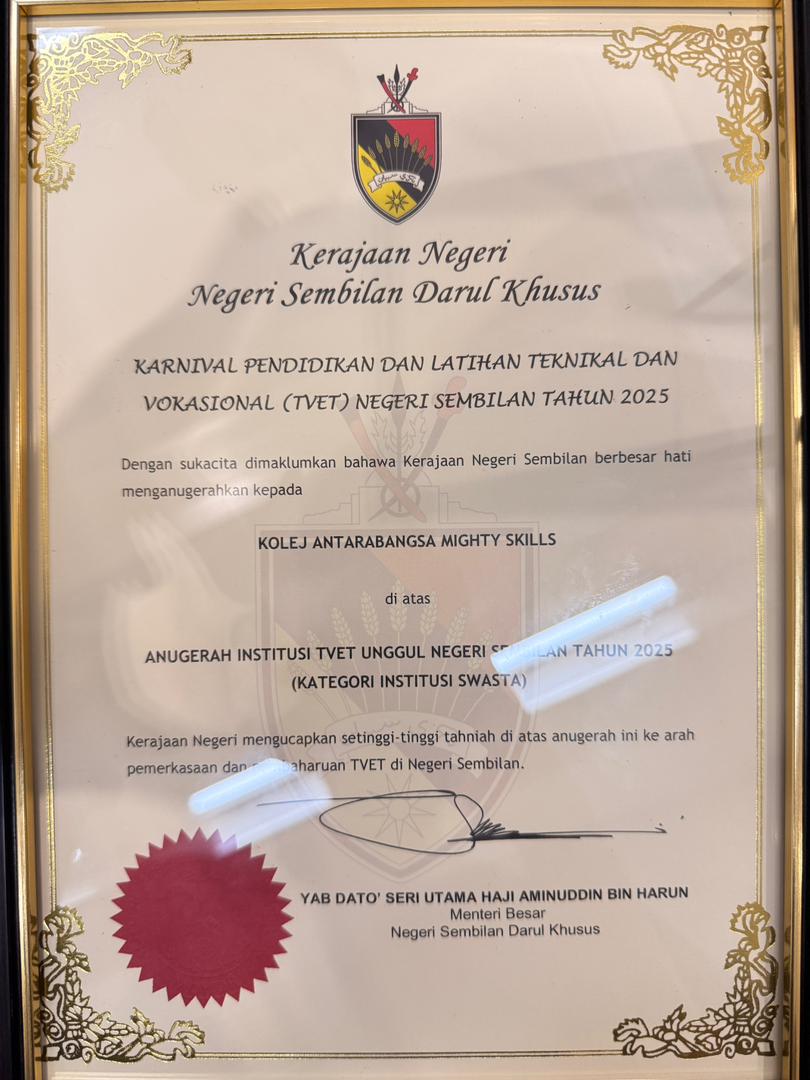 Alhamdulillah! On 6 November 2025 (Thursday), Kolej Antarabangsa Mighty Skills (KAMS) was truly honoured to receive the Outstanding TVET Institution Award, Negeri Sembilan 2025 (Private Institution Category) at the Negeri Sembilan TVET Carnival 2025, held at the Seremban City Council Hall.